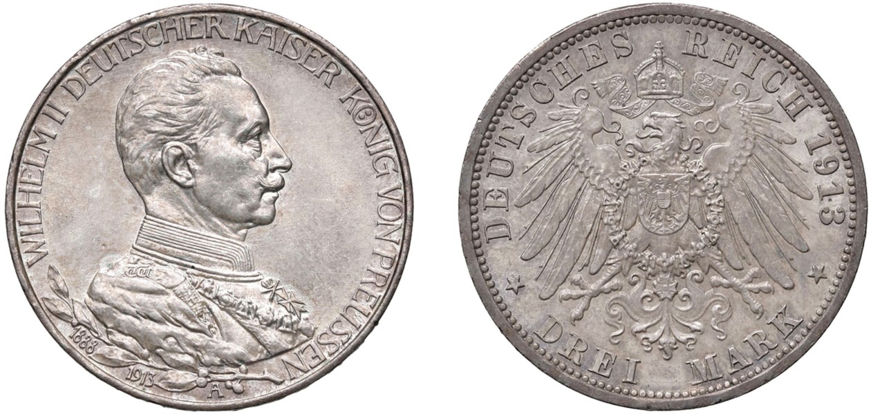 GERMANIA - PRUSSIA - GUGLIELMO II (1888-1918) - 3 marchi 1913 A, 25° Anniversario di Regno.