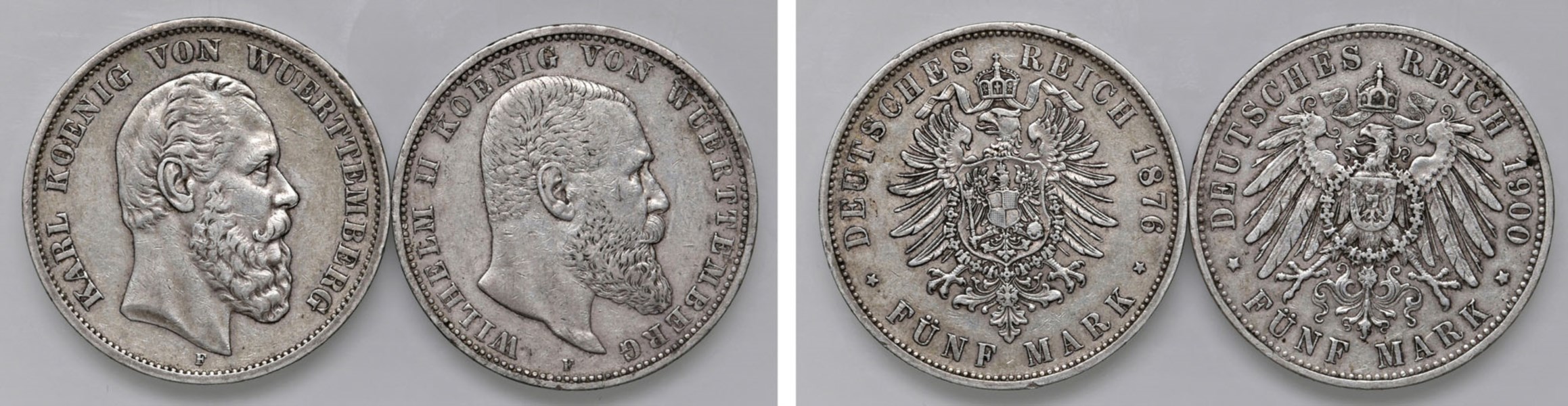 GERMANIA - WURTTEMBERG - CARLO I e GUGLIELMO II (1864-1891) - Lotto due monete da 5 Marchi (1876 e 1900 F).