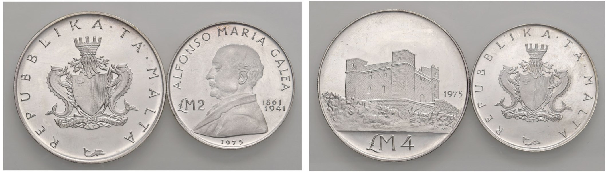 MALTA - Lotto due monete da 2 e 4 Pounds, 1975.