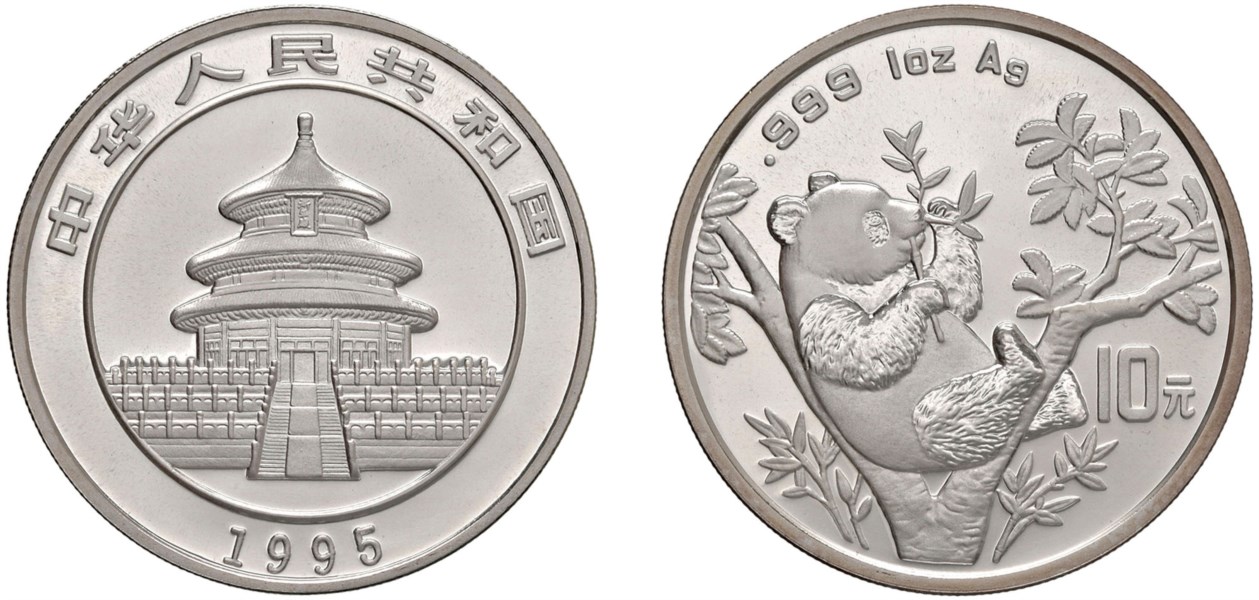 CINA - Repubblica Popolare (1949-) - 10 Yuan da 1 oncia, Serie Panda Proof, 1995.