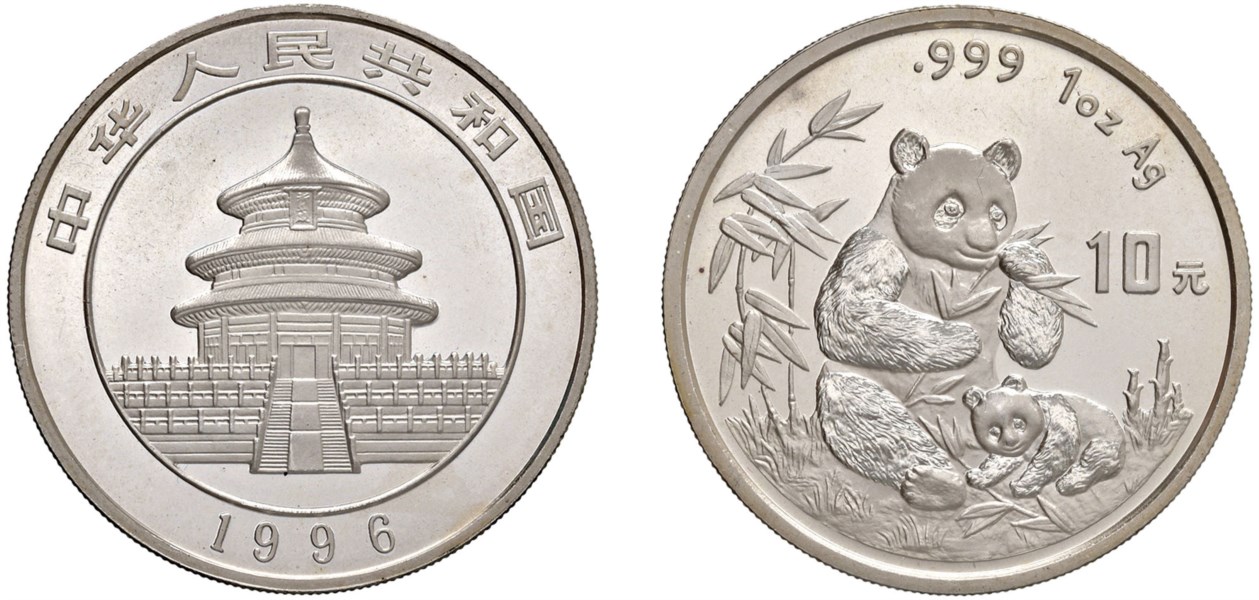 CINA - Repubblica Popolare (1949-) - 10 Yuan da 1 oncia, Serie Panda Proof, 1996.