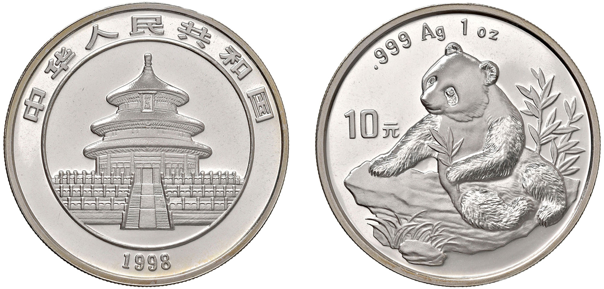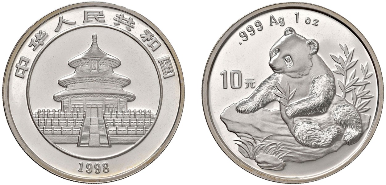 CINA - Repubblica Popolare (1949-) - 10 Yuan da 1 oncia, Serie Panda Proof, 1998.