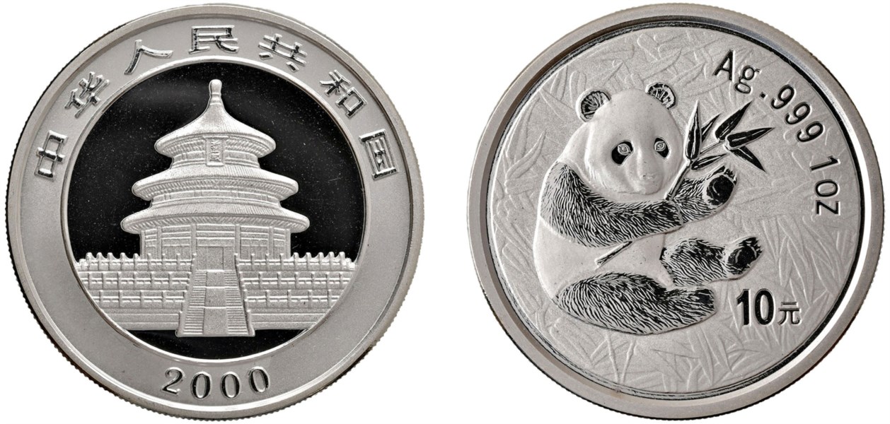 CINA - Repubblica Popolare (1949-) - 10 Yuan da 1 oncia, Serie Panda Proof, 2000.
