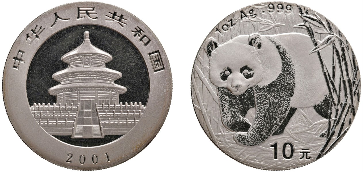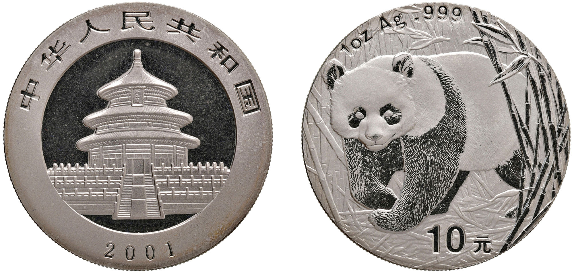 CINA - Repubblica Popolare (1949-) - 10 Yuan da 1 oncia, Serie Panda Proof, 2001.
