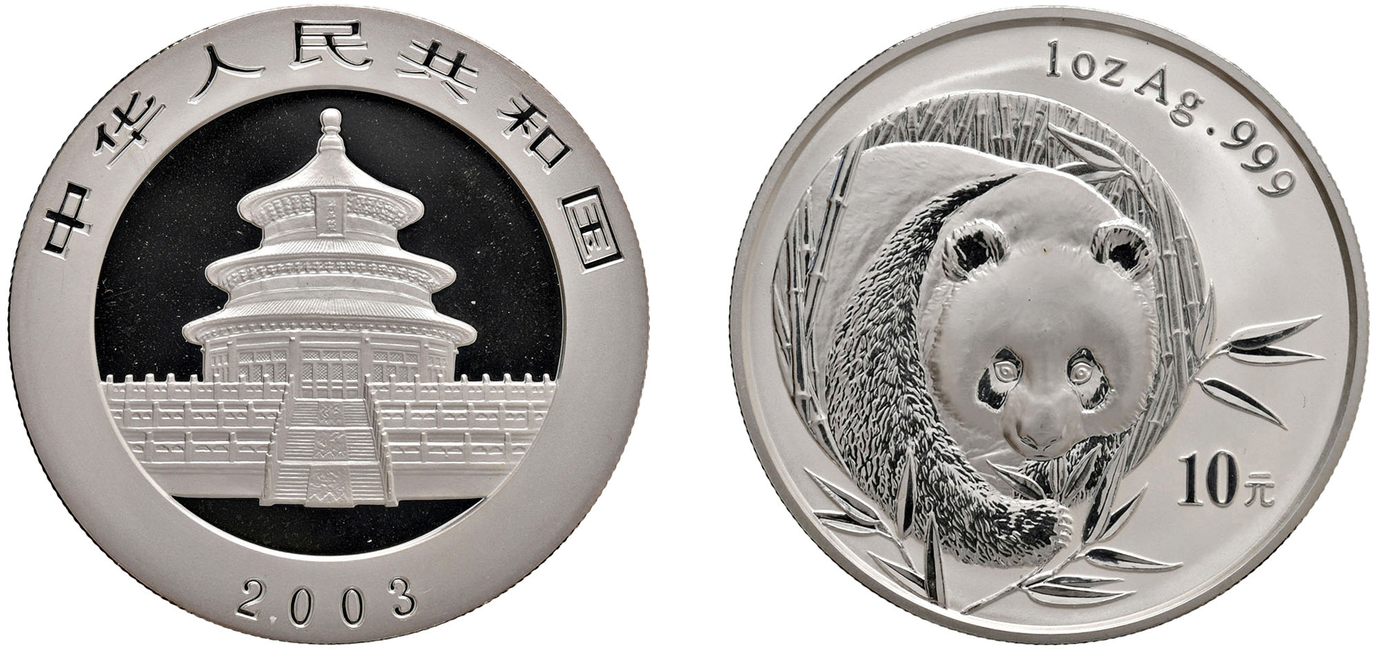 CINA - Repubblica Popolare (1949-) - 10 Yuan da 1 oncia, Serie Panda Proof, 2003.