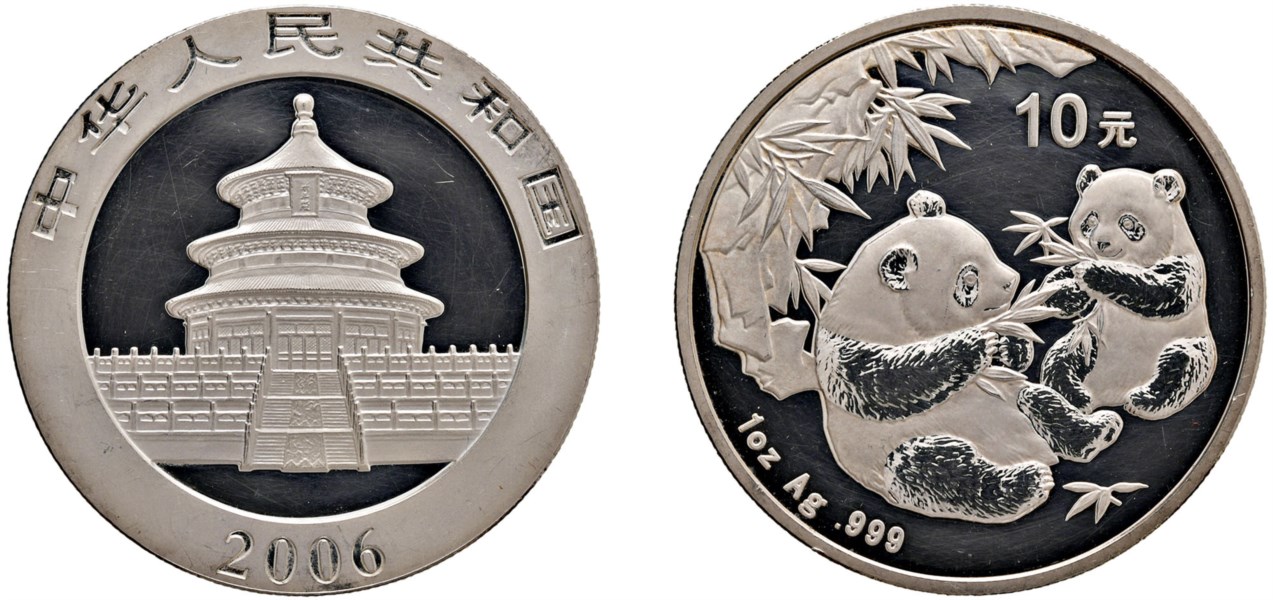 CINA - Repubblica Popolare (1949-) - 10 Yuan da 1 oncia, Serie Panda Proof, 2006.