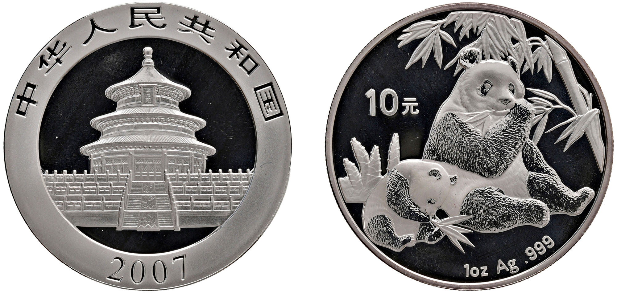 CINA - Repubblica Popolare (1949-) - 10 Yuan da 1 oncia, Serie Panda Proof, 2007.