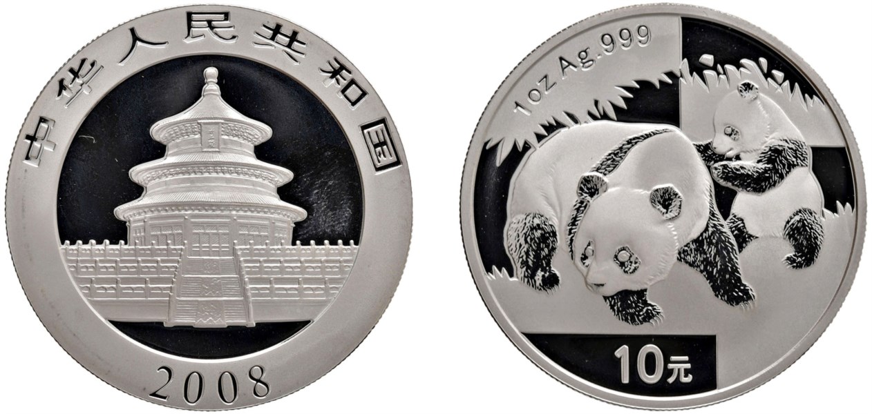 CINA - Repubblica Popolare (1949-) - 10 Yuan da 1 oncia, Serie Panda Proof, 2008.