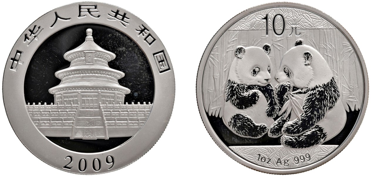 CINA - Repubblica Popolare (1949-) - 10 Yuan da 1 oncia, Serie Panda Proof, 2009.