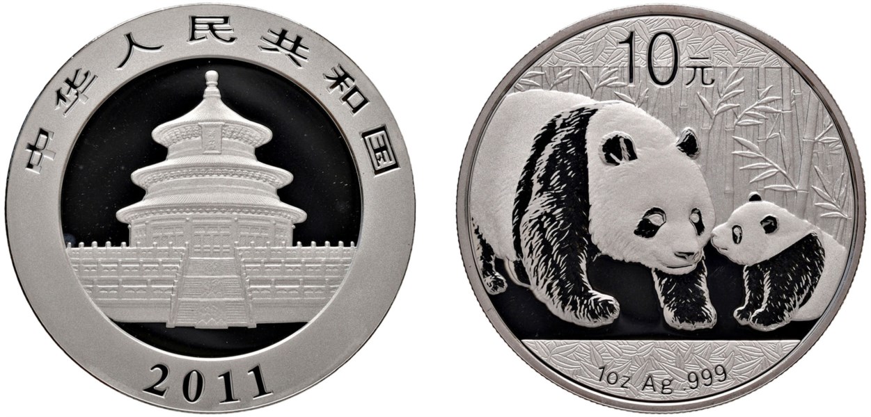 CINA - Repubblica Popolare (1949-) - 10 Yuan da 1 oncia, Serie Panda Proof, 2011.