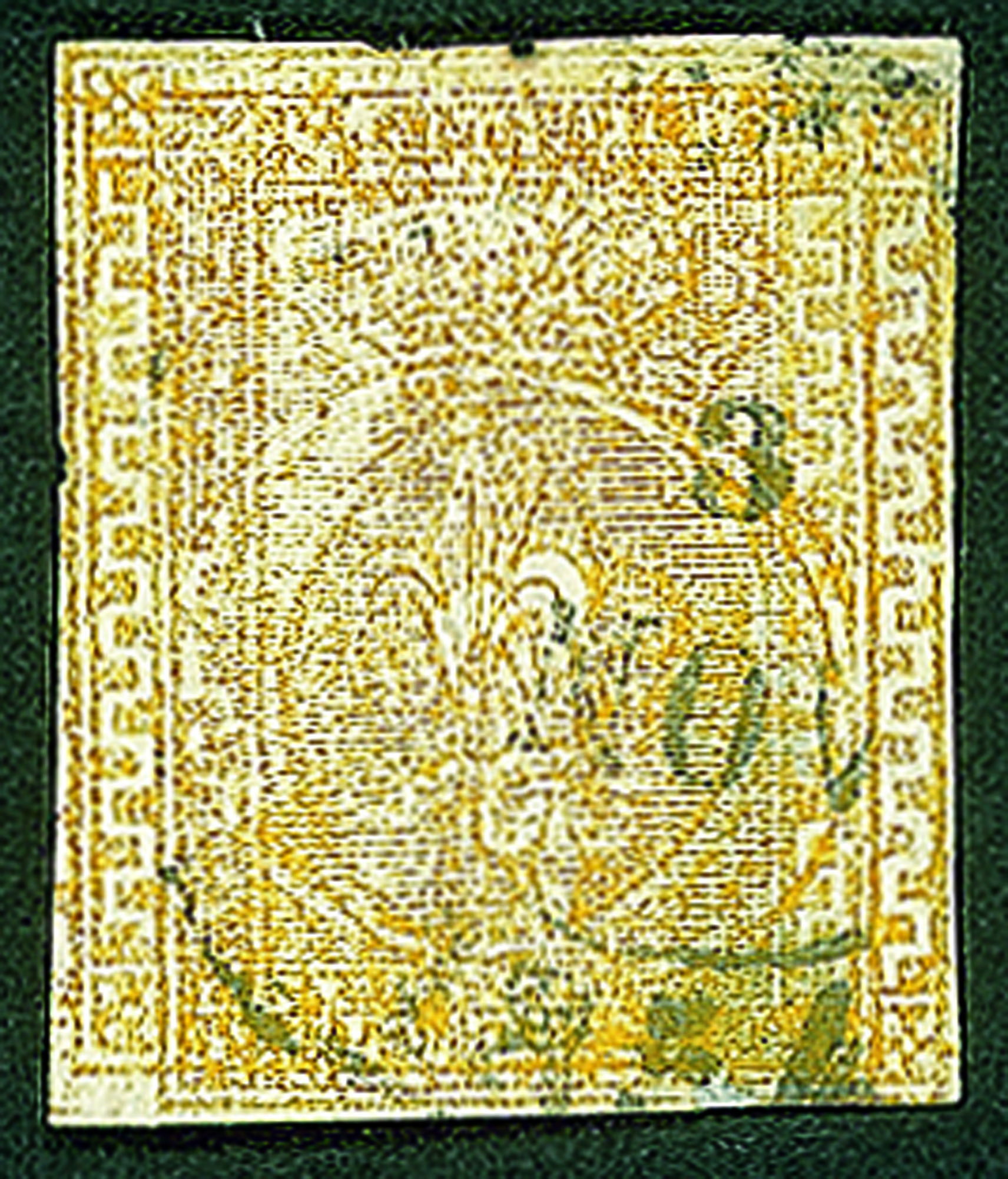 Con doppia stampa molto evidente e discosta, annullo di PIACENZA 3 NOV.1854, dal cert. E.Diena ¿ dei tre soli esemplari noti di questa varietà, è quello in cui lo spostamento fra le due stampe è più forte. - cert. Raybaudi e E. Diena