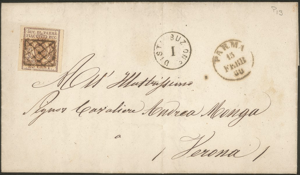 Annullato a griglietta con a lato il cerchio piccolo di PARMA 13 FEBB:59 (P.ti 13) per Verona, sul fronte il bollo DISTRIBUZIONE I di Verona, bella qualità