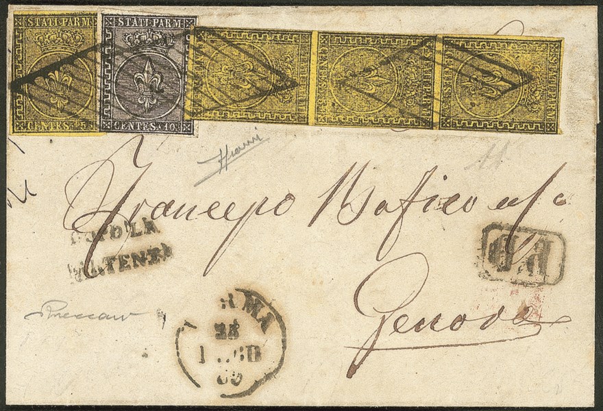 A lato i bolli DOPO LA PARTENZA E P.D. in cartella, in esatta tariffa per Genova, la losanga fu data in uso ai soli uffici di Parma e Piacenza tra la fine di febbraio e inizio marzo 1859, questa rappresenta la prima data nota dell'ufficio di Parma. Cert.Sorani, P.Vaccari