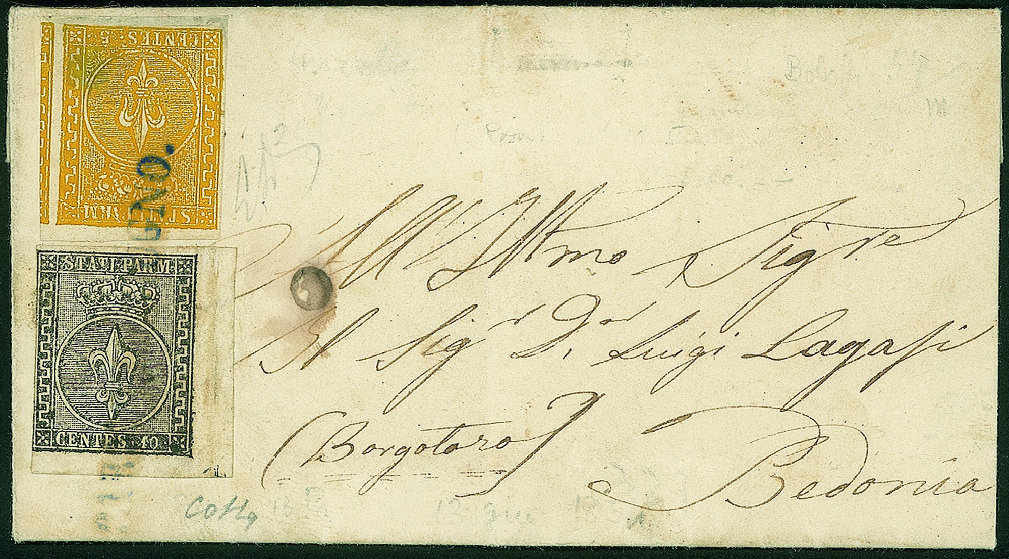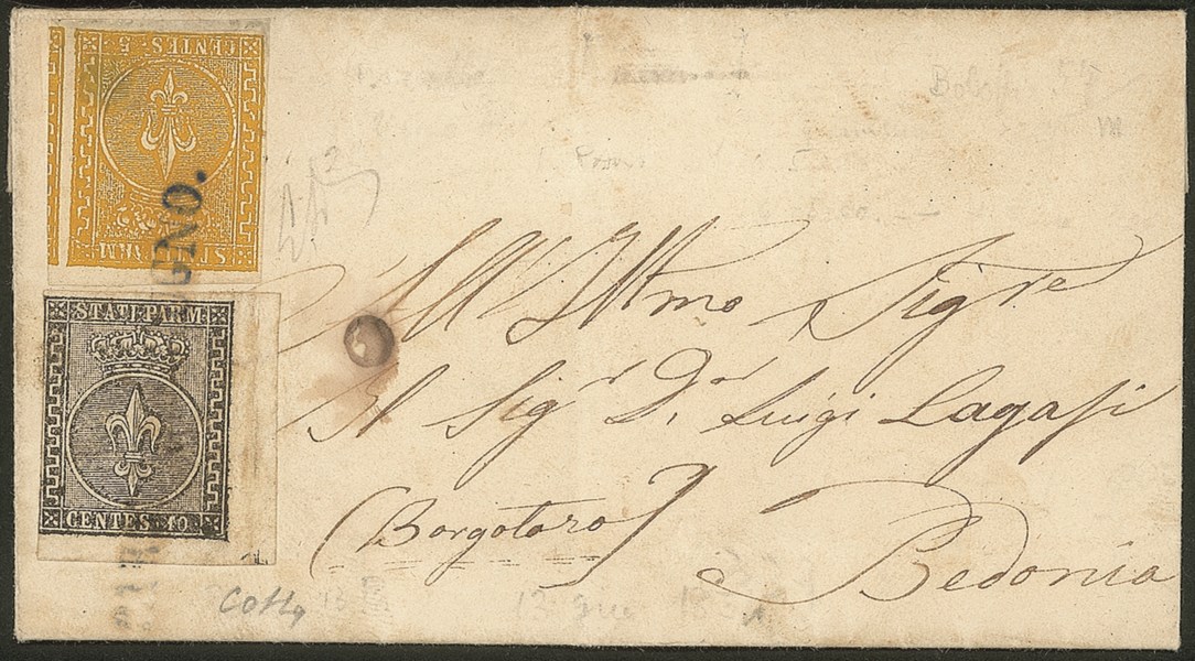 Antichi Stati Italiani - Parma - Lettera con c.10 nero, angolo di foglio prima emissione + c.5 giallo arancio seconda emissione