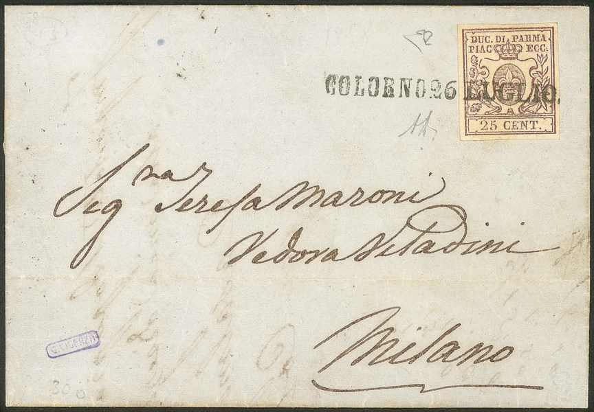 In nero azzurrastro, COLORNO 26 LUGLIO del 1858 per Milano, cert. E.Diena