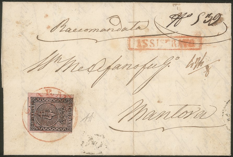 Annullo d.c. rosso PARMA + lineare in cartella rossa ASSICURATO, al verso c.25 rosso bruno diretta a Mantova, al verso il bollo in cartella ARR.TA DI NOTTE