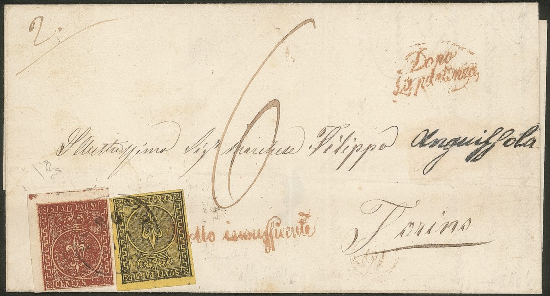 Antichi Stati Italiani - Parma - Lettera doppio porto con c.5 giallo prima emissione + c.25 bruno rosso