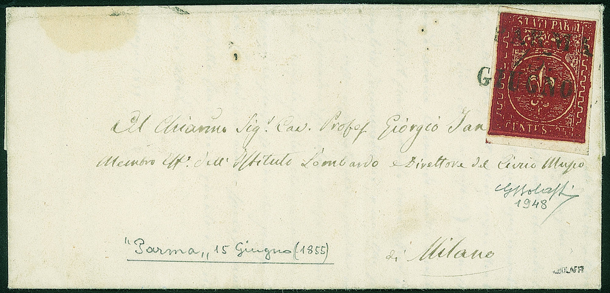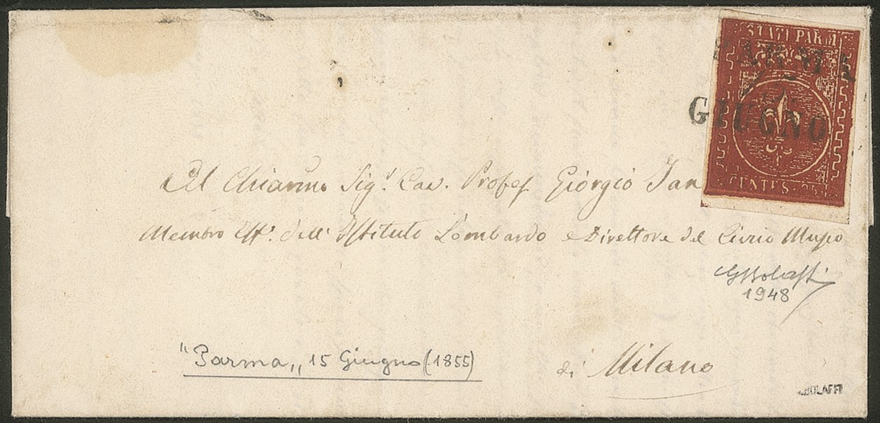 In tariffa di primo porto per la seconda distanza con c.25 bruno rosso da PARMA 15 GIUGNO del 1855 per Milano. Cert. G.Bolaffi