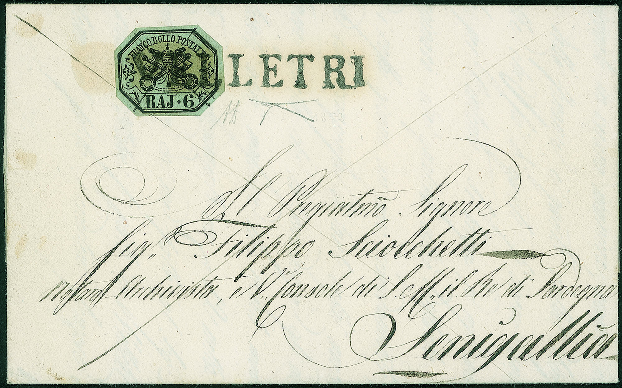 Antichi Stati Italiani - Stato Pontificio - Da Velletri a Senigallia il 16 dicembre 1852 con 6 baj con taglio esagonale (Sass. 7)