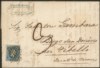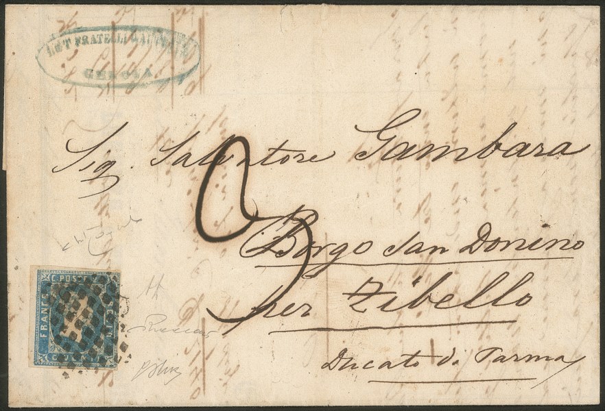 Affrancata con c.20 azzurro (2) di Sardegna e diretta a Zibello con segno di tassa 3 decimi in periodo preconvenzione, firma Vaccari cert. Raybaudi