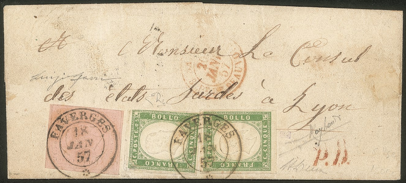 Un esemplare legermente corto a destra, da FAVERGES 18 GEN.57 per Lione, cert. E.Diena
