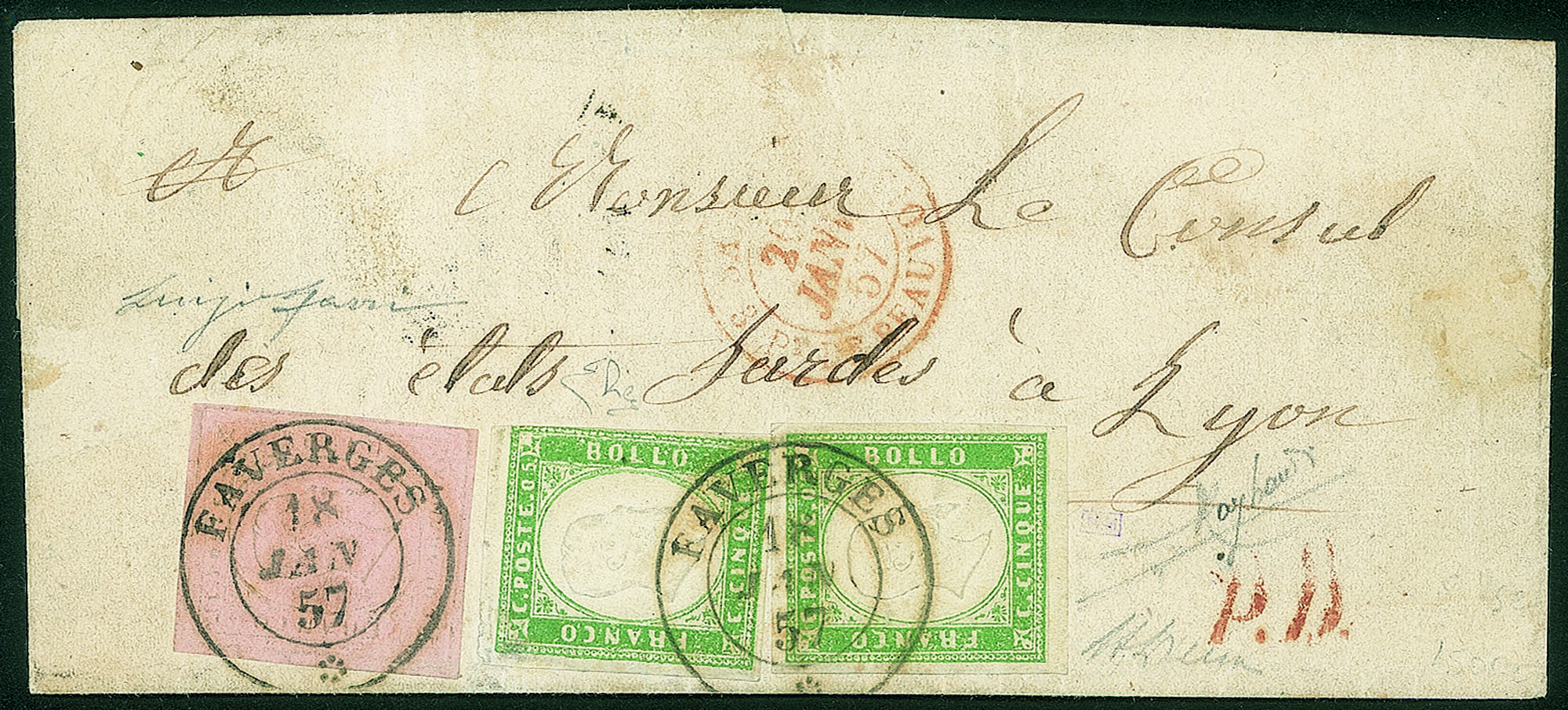 Antichi Stati Italiani - Sardegna - Lettera per la Francia con seconda emissione c.40 rosa + quarta emissione due esemplari c.5 verde pisello (6a+13c)