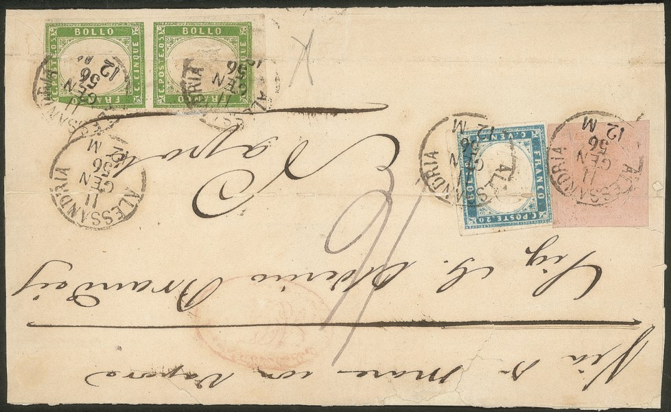 Viaggiata coi Piroscafi Postali Francesi in tariffa da 70 centesimi per Napoli e affrancata con seconda emissione c.40 rosa+ IV emissione c.20 cobalto + coppia c.5 verde giallo (6a+ 13a + 15) da ALESSANDRIA 11 GEN.56, nonostante i difetti insieme molto raro e fresco, cert. G.Bottacchi