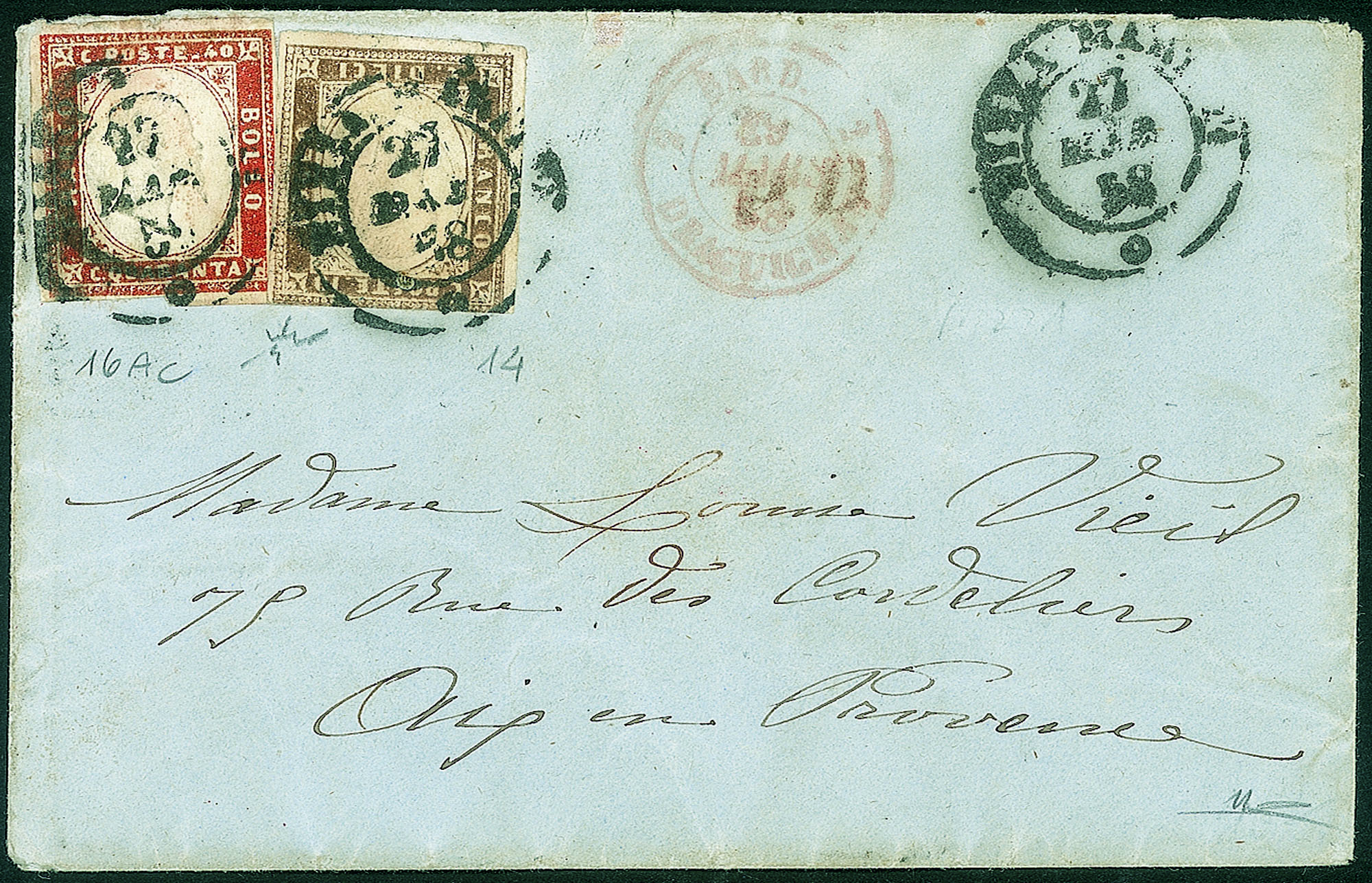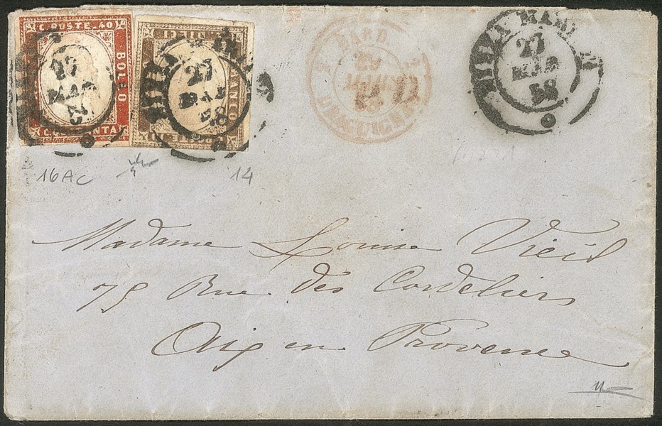 Antichi Stati Italiani - Sardegna - Bustina affrancata con 10 cent terra d'ombra (14) + 40 cent vermiglio arancio scuro (16Ac)