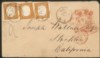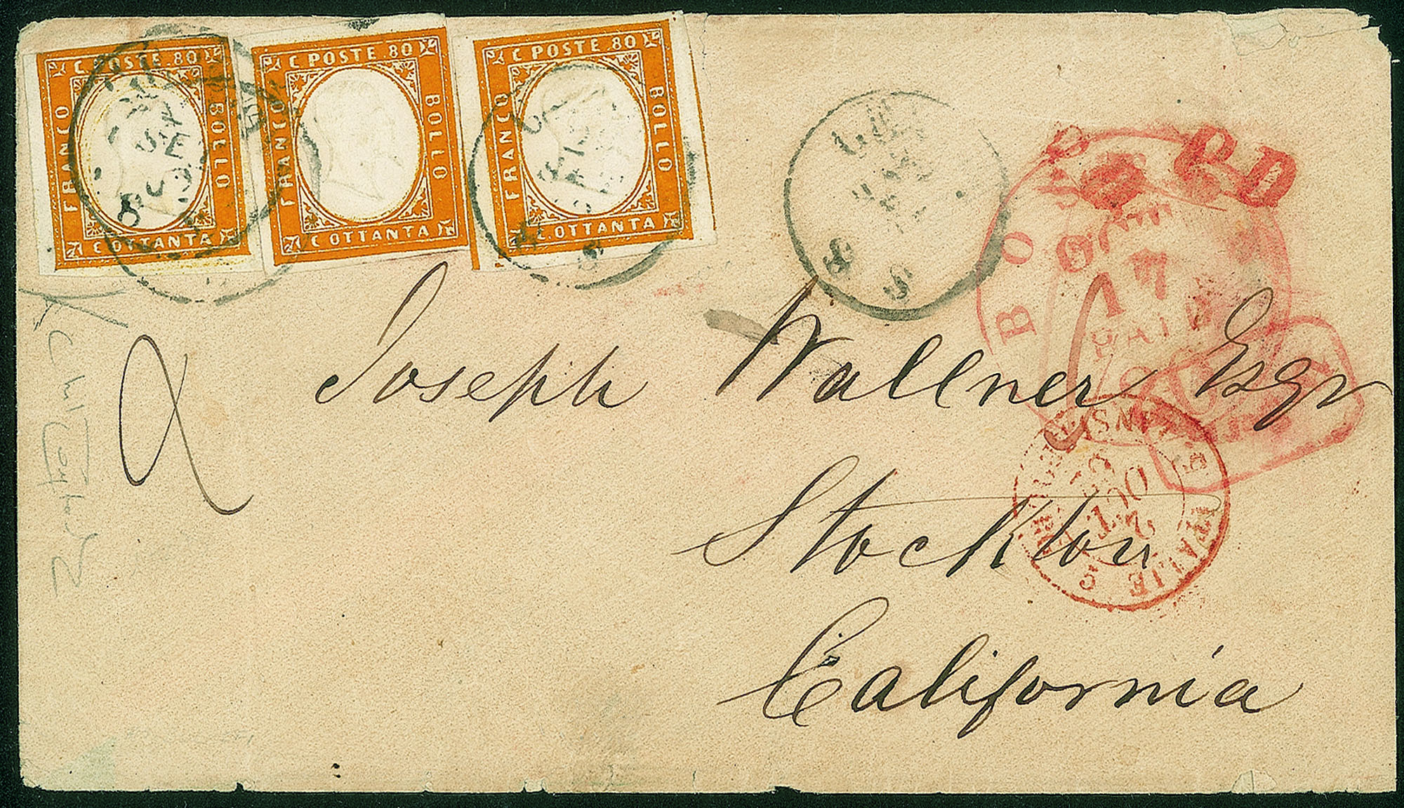 Antichi Stati Italiani - Sardegna - Lettera doppio porto per la California affrancata con tre esemplari c.80 arancio carico (17D)