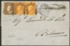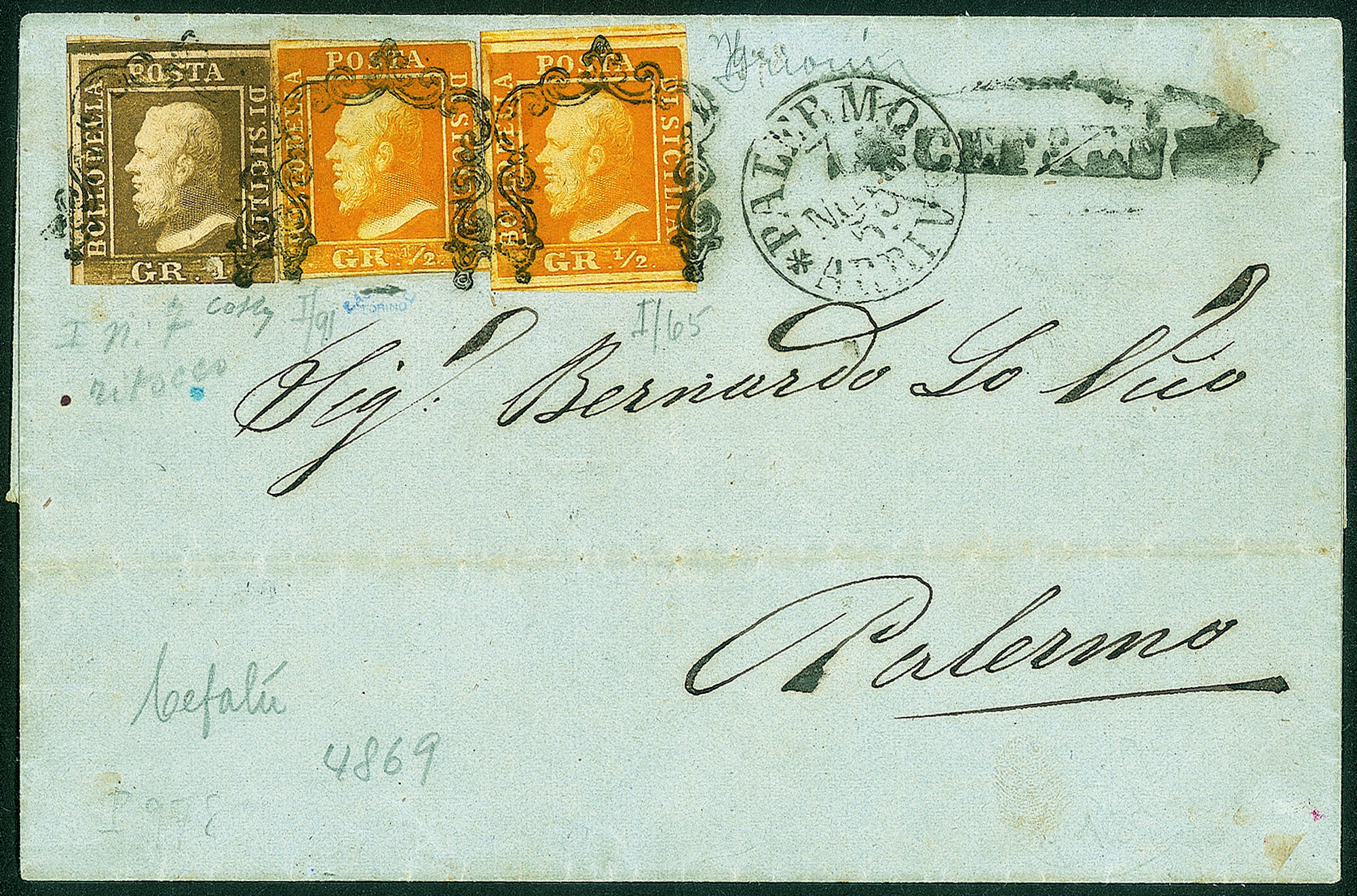 Antichi Stati Italiani - Sicilia - Lettera afftrancata con due esemplari 1/2 grano arancio, prima tavola + gr. 1 bruno ruggine con ritocco n.7 (1a + 3)