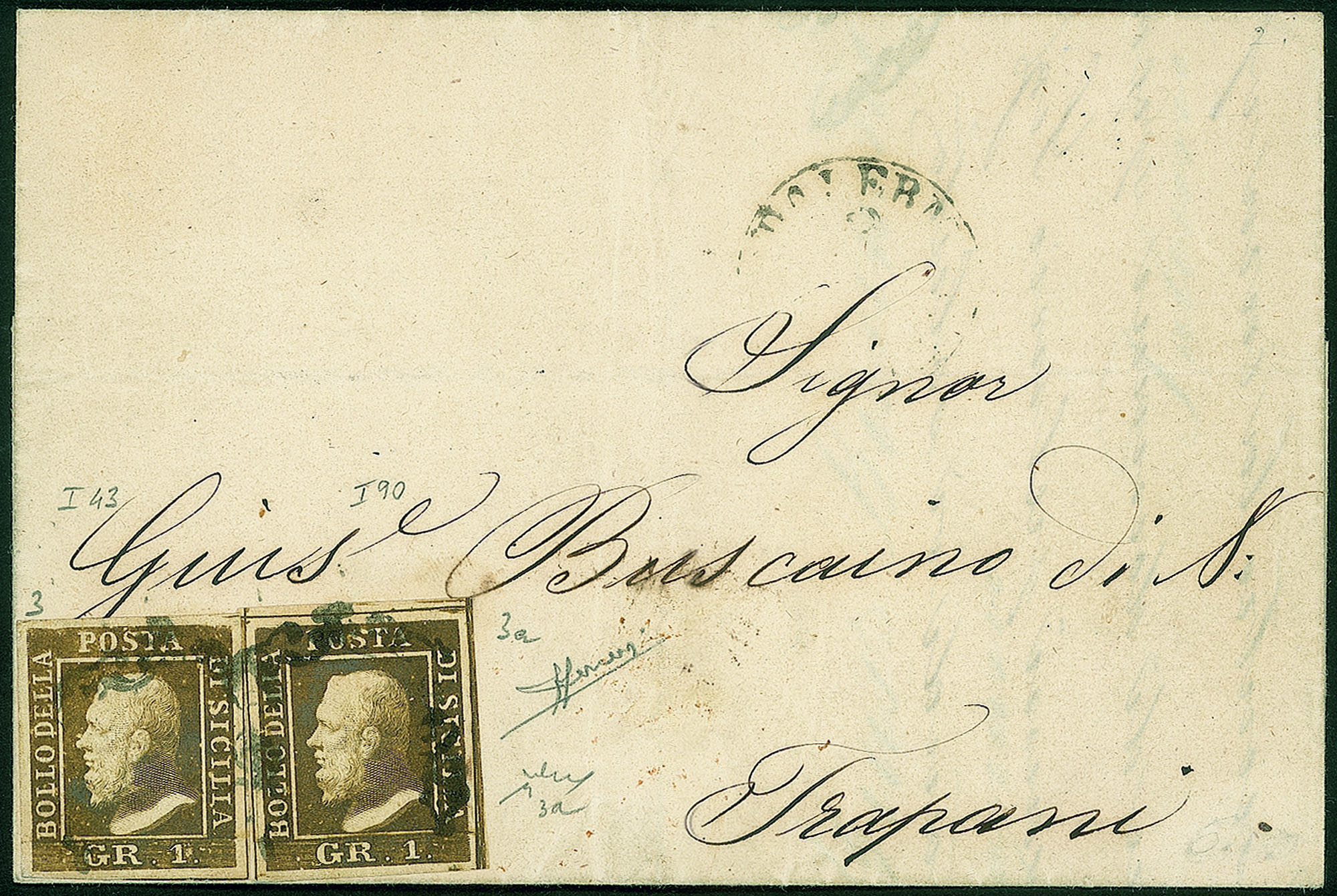 Antichi Stati Italiani - Sicilia - Lettera affrancata con 1 grano bruno ruggine I tavola pos.43 + 1 grano bruno ruggine intenso I tavola pos.90 (3 + 3a cat.17500)