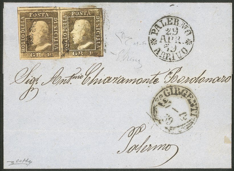 Antichi Stati Italiani - Sicilia - Lettera coppia gr.1 verde oliva grigiastro, I tavola II stato