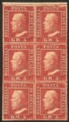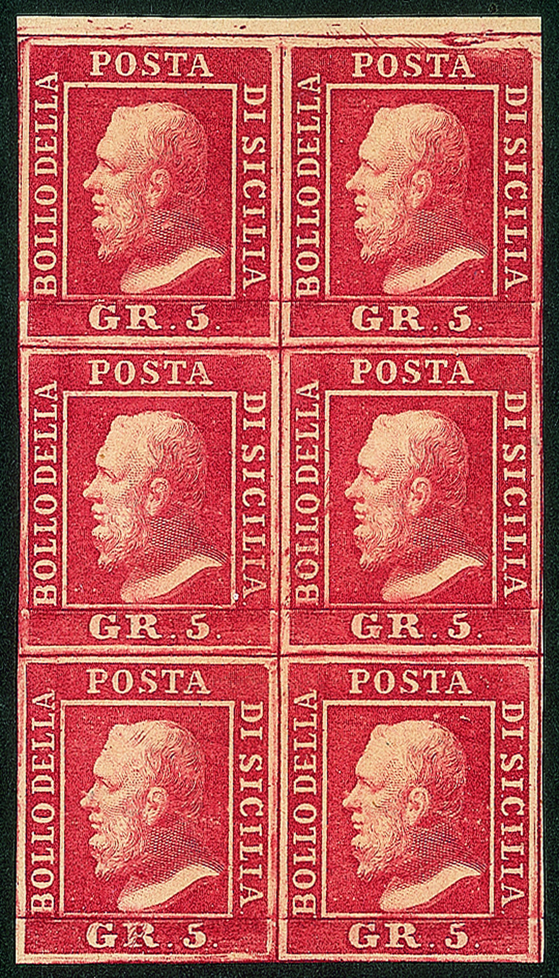 Antichi Stati Italiani - Sicilia - Blocco di 6 es. del 5 gr. carminio I° tav. (Sass. 9a)