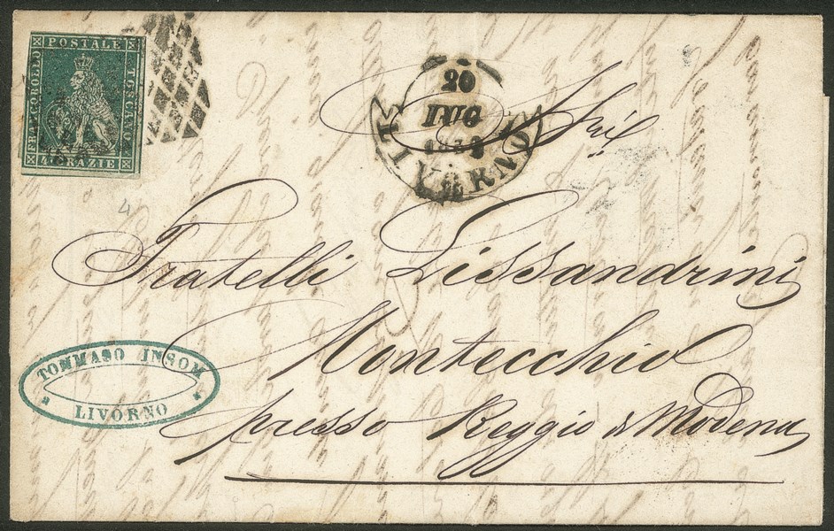 Annullato con bollo muto a rombi, a lato bollo a bandella LIVORNO 20 LUG.1852 (6 cat.1300)