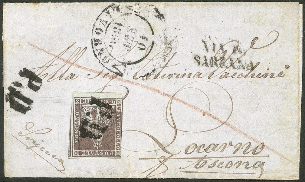 Annullato con bollo P.D. da LIVORNO 10 SET.1856 per Ascona con bollo VIA DI SARZANA, francobollo con tre grandi margini ma intaccato a destra in alto
