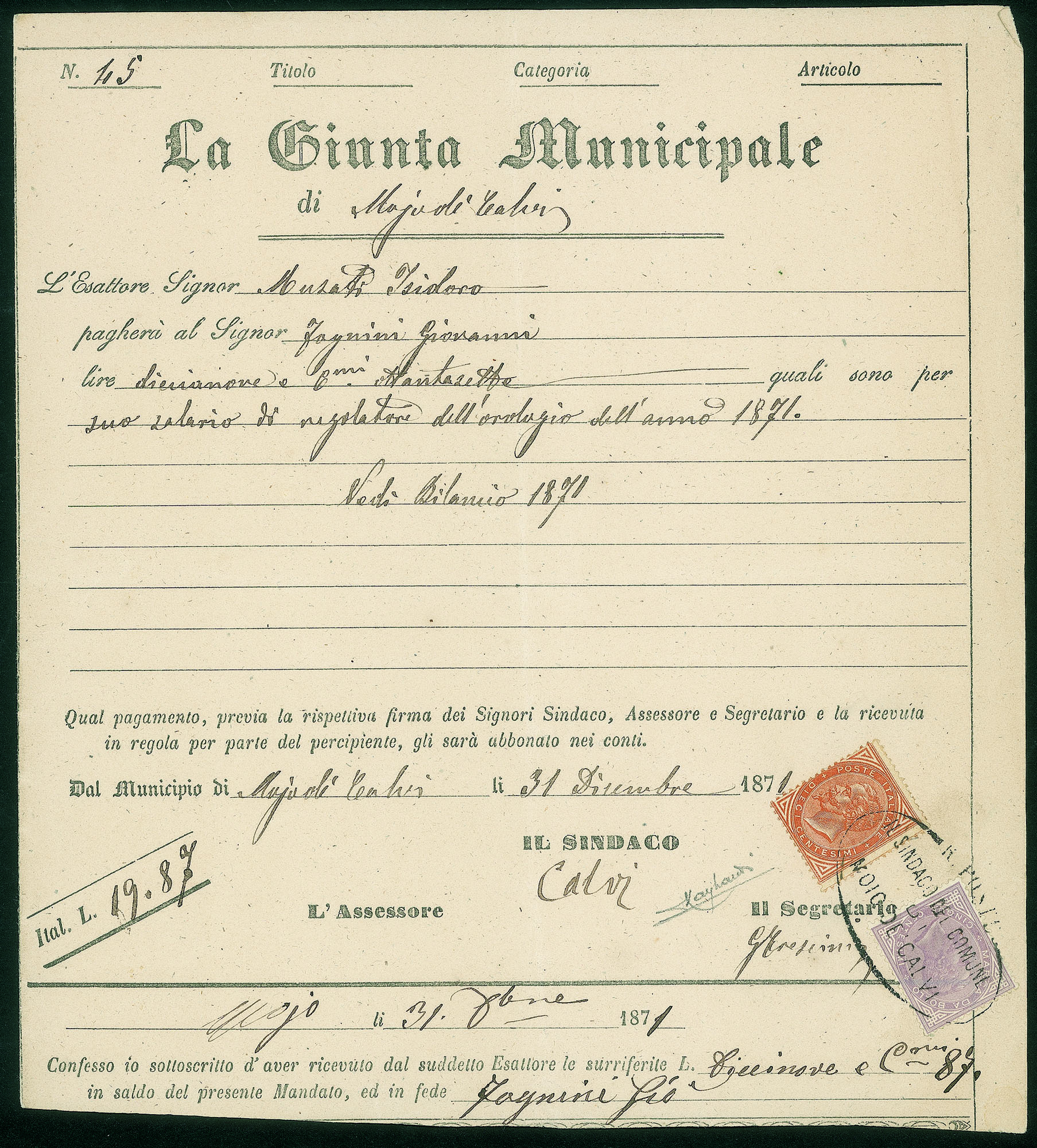 Su mandato di pagamento da Moio de Calvi del 31.12.71 - combinazione molto bella - cert. Raybaudi