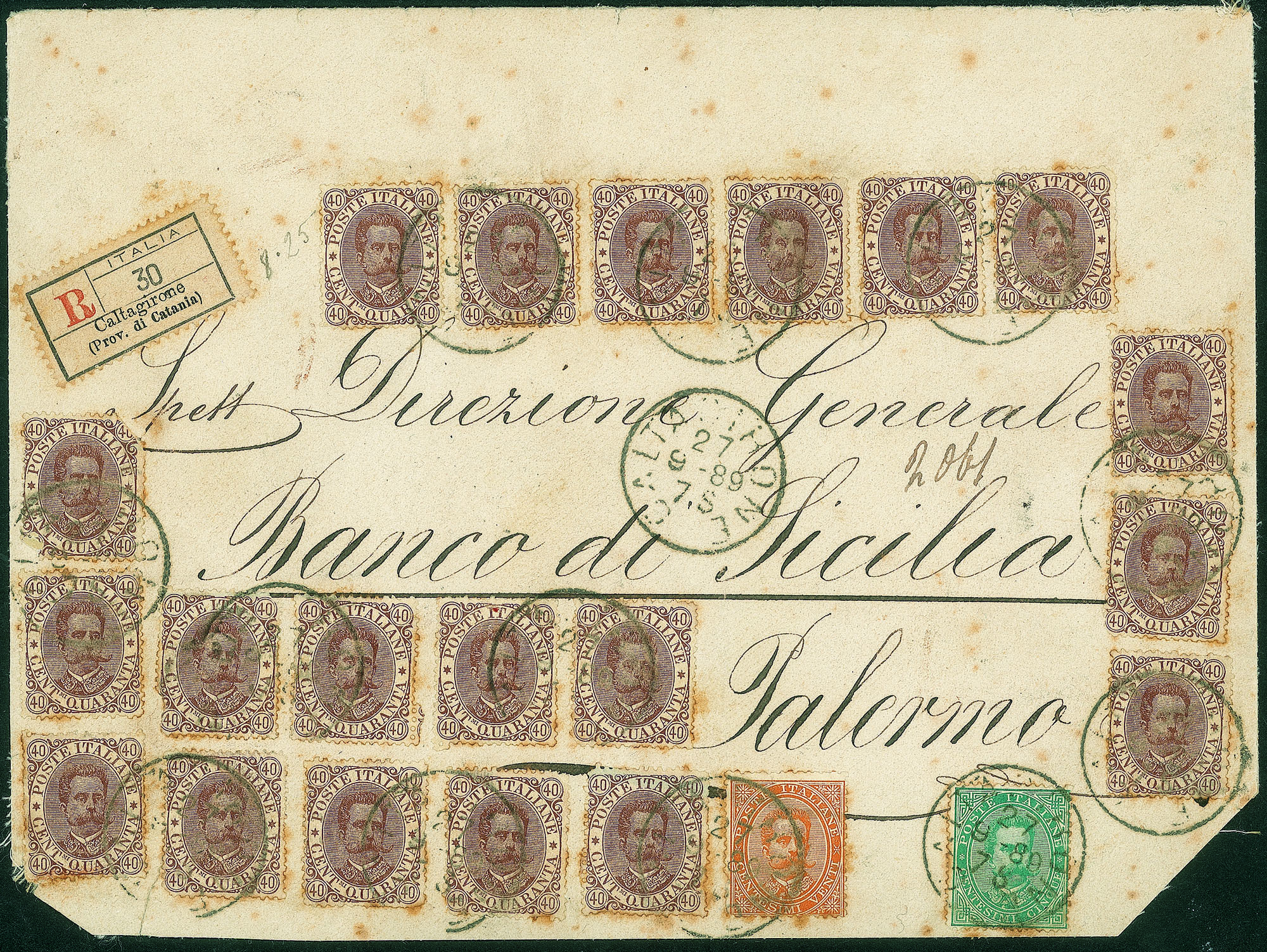 Affrancata con c.5 verde + c.20 arancio + venti esemplari del c.40 bruno (37 + 38 + 45) da CALTAGIRONE 27.9.89 per Palermo, qualche ingiallimento, raro porto multiplo