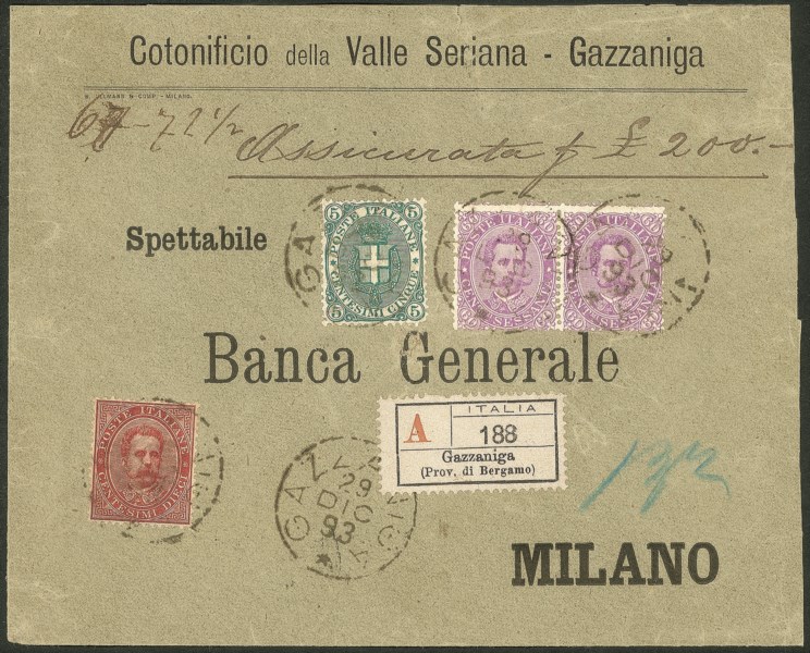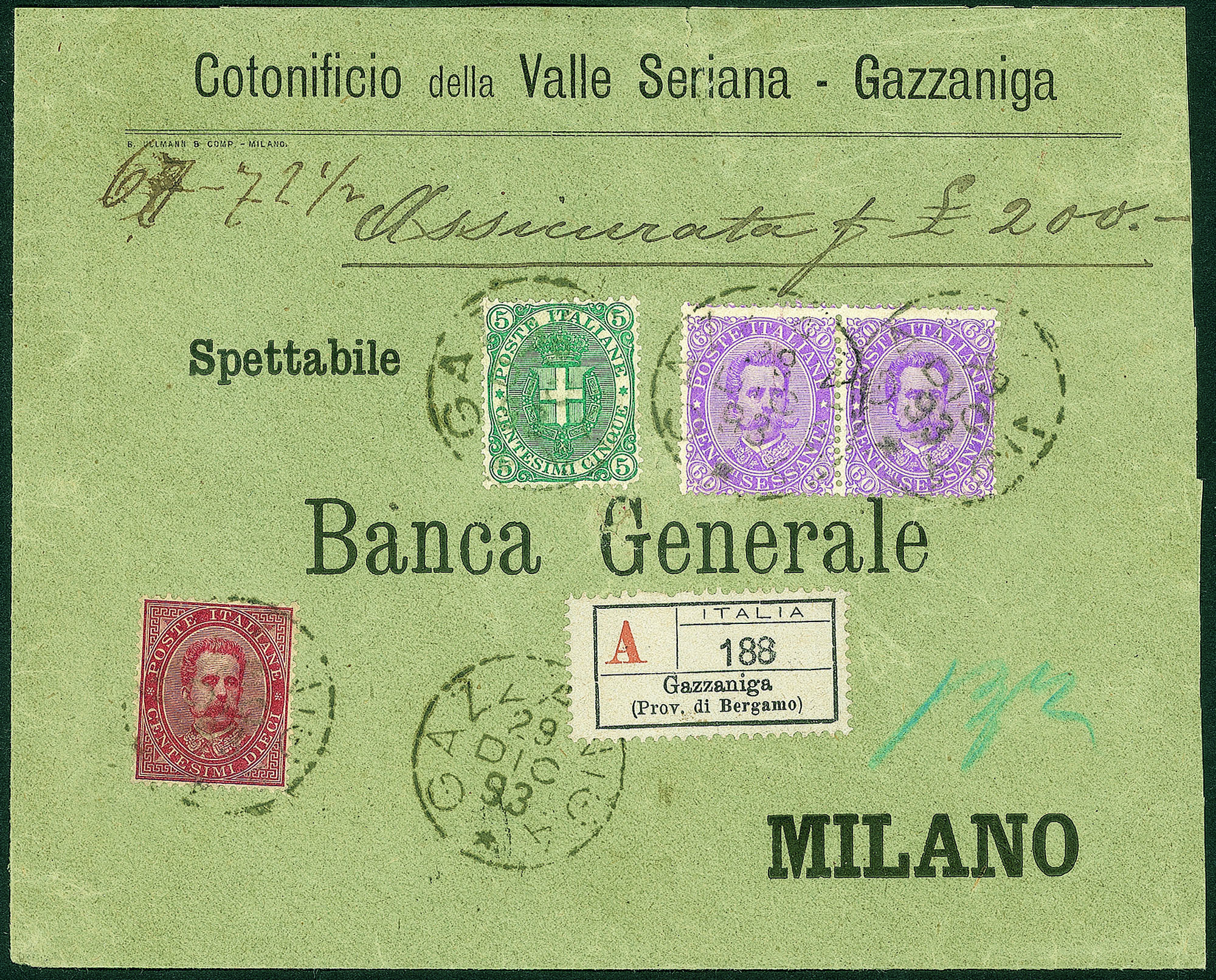 Regno - Umberto I - Assicurata con c.5 verde + c.10 carminio + coppia c.60 violetto (38 + 47 + 59 cat.1900+)