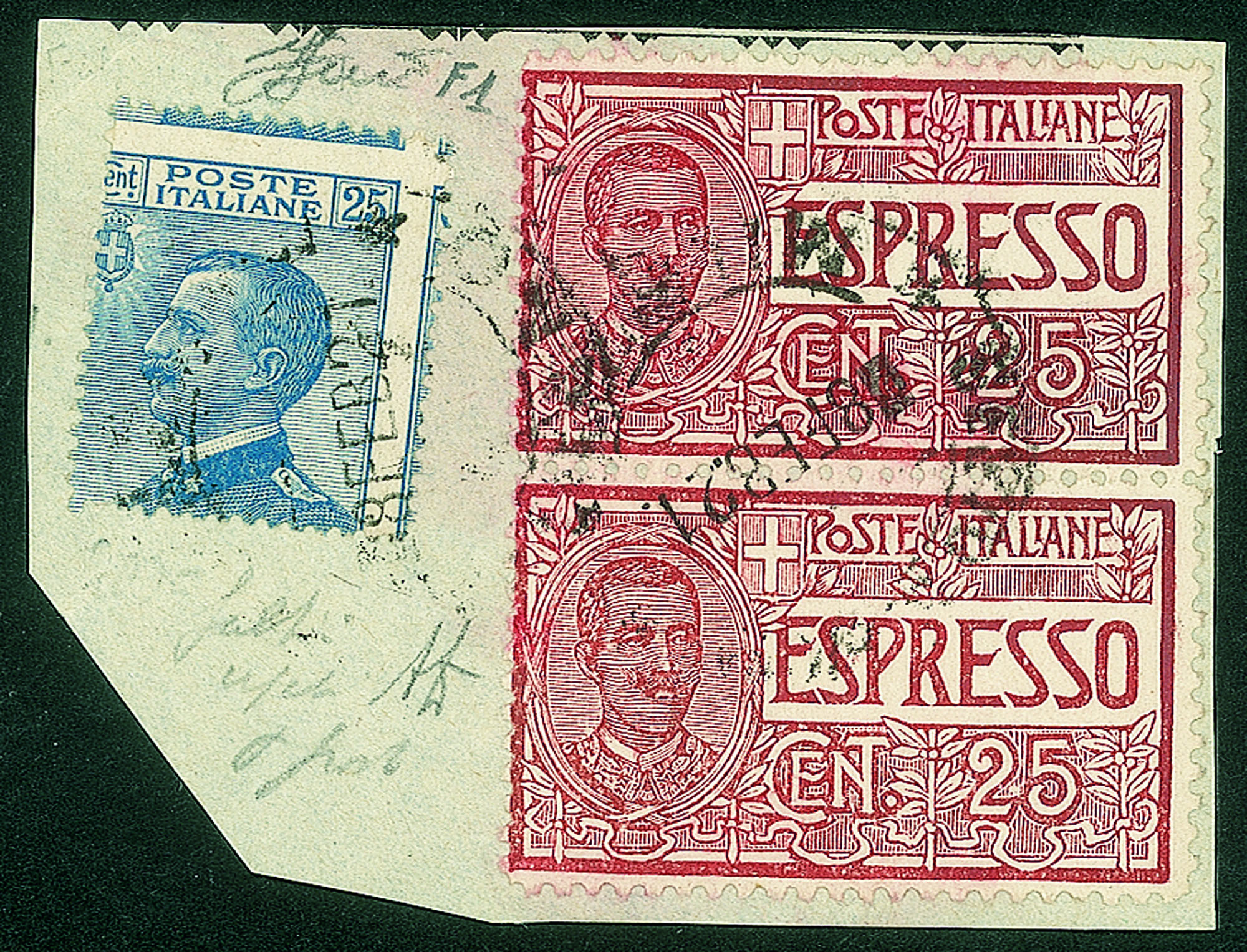 Regno - Vittorio Emanuele III - Frammento del 18.2.1921 con 25 cent. azzurro + Espressi 1920