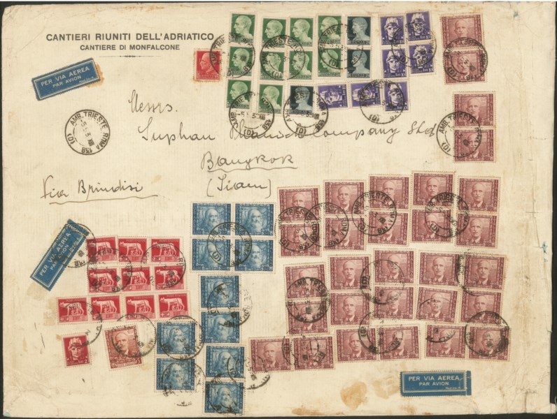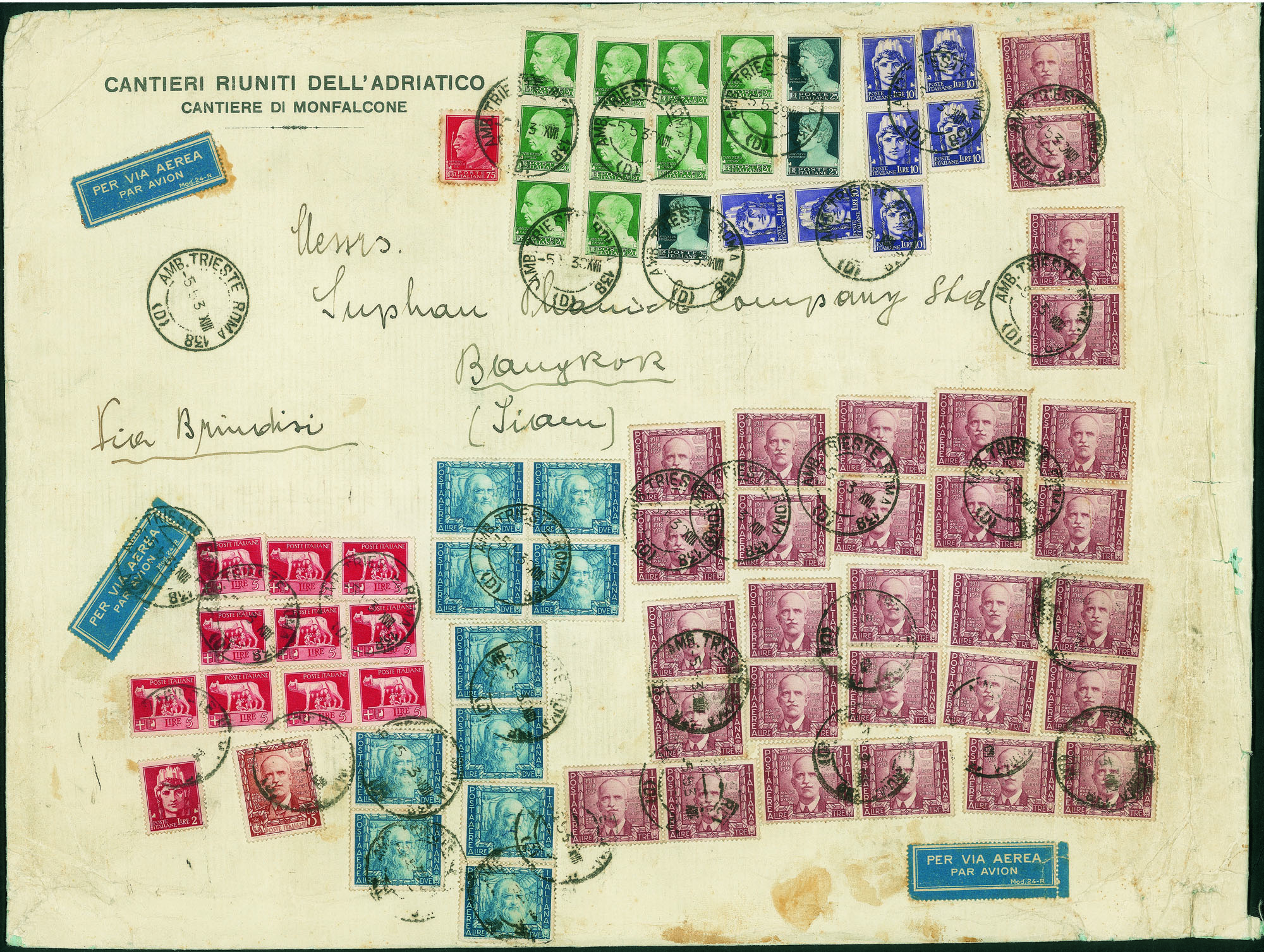 Con splendida affrancatura multipla composta da alti valori Imperiale (252 + 255 + dieci 257 + sette 258 + dieci 259 + tre 260) e alti valori della serie Impero (448 + dieci 114 Aerea + trenta 115 Aerea) da Trieste del 5.5.39 per Bangkok (Siam) - altissima affrancatura probabilmente unica nel suo insieme - oggetto splendido da cornice - oltre 28.000 euro di catalogo