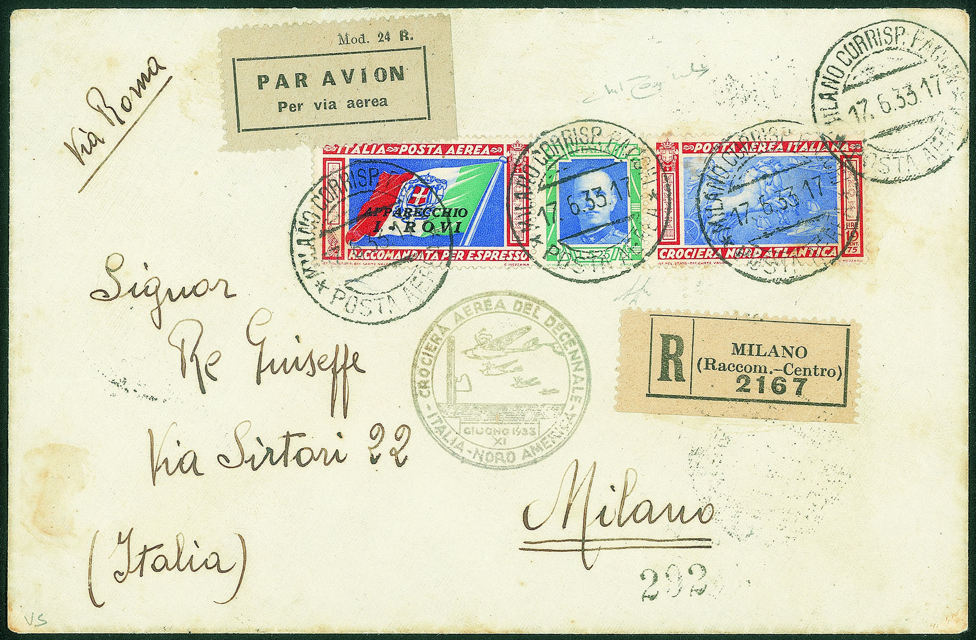 Aerogramma raccomandato espresso con Trittico I-ROVI (51R) da Roma ad Amsterdam del 17.6.33 - cert. oro Raybaudi