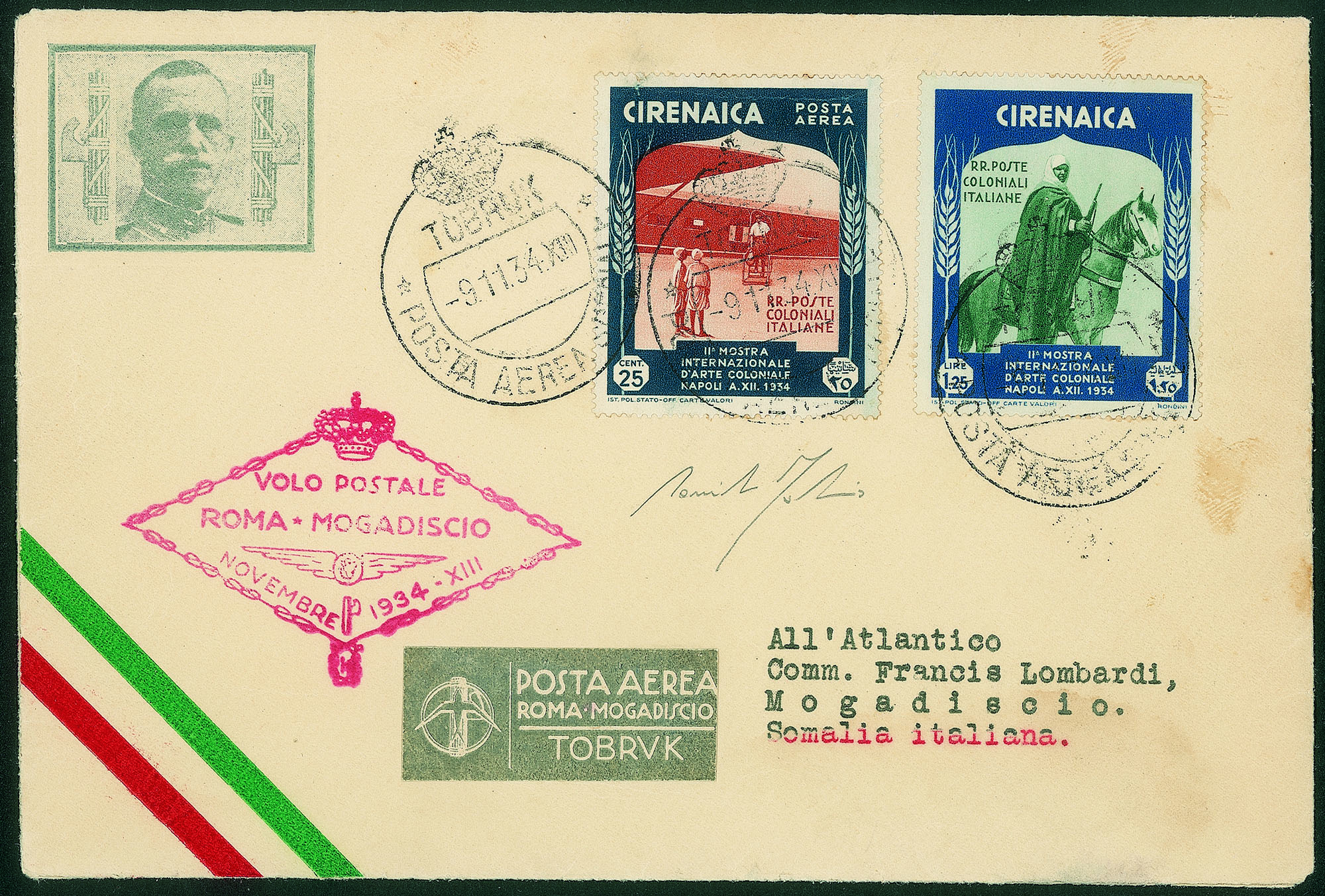 Aerogramma del volo speciale delle tappa Tobruk Mogadiscio del 9.11.34 - cert Fabris
