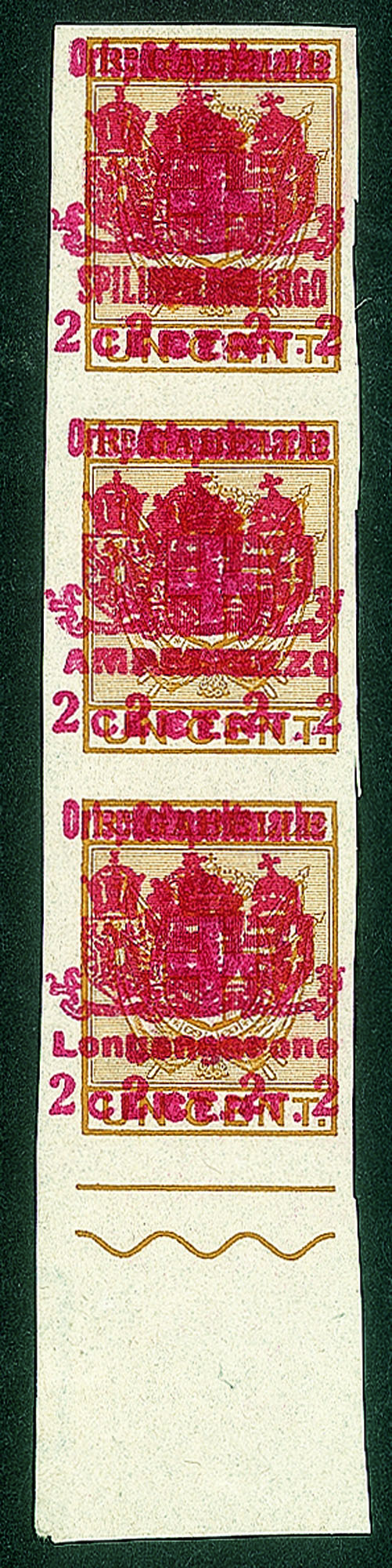 Occupazioni I guerra mondiale - Striscia di tre verticale del 2 su 1 cent (58aa + 2aa + 26ab)