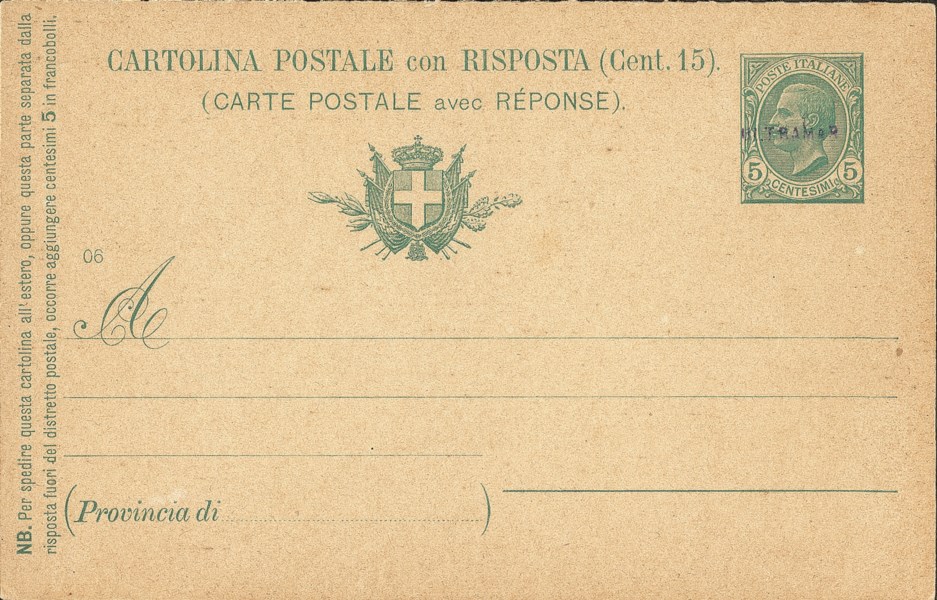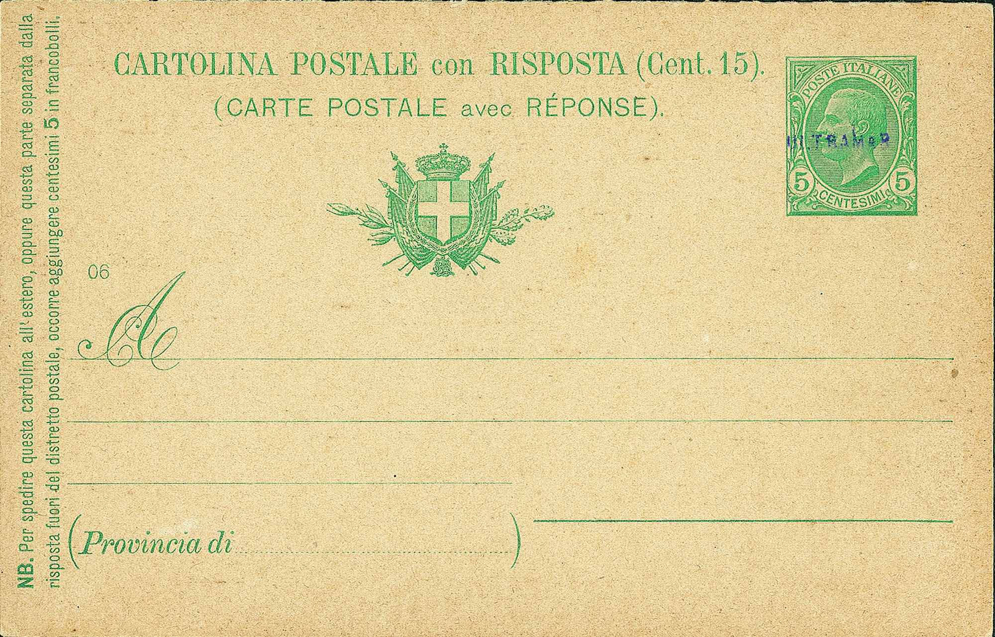Uffici postali all'Estero - Ultramar - Saggio - Cartolina postale con Risposta da 5+10 cent (tipo C34a)