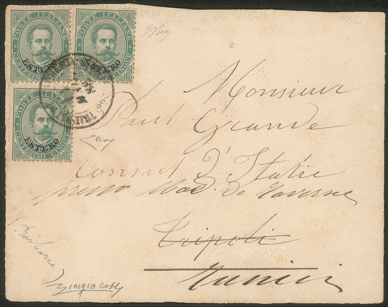Uffici postali all'Estero - Busta per Tunisi affrancata con tre es. del 5 cent (12)