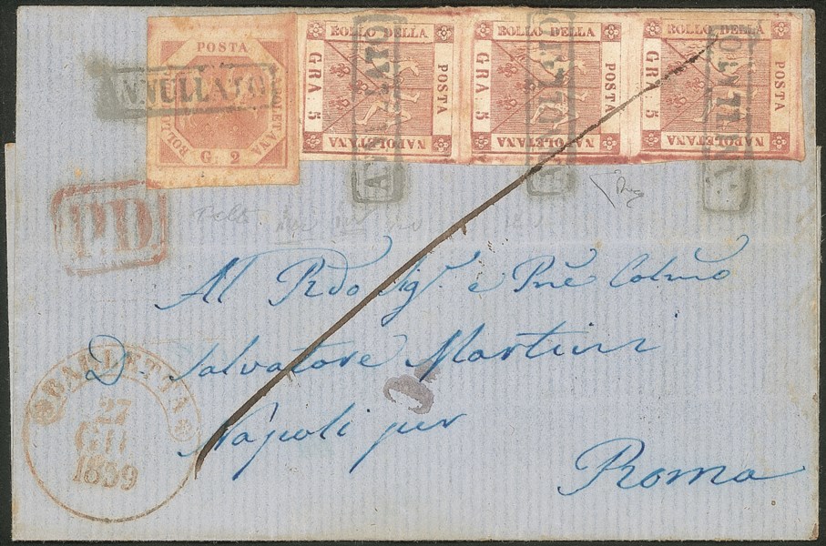 Antichi Stati Italiani - Napoli - Lettera con striscia di tre del 5 grana + esemplare 2 grana (8+7)
