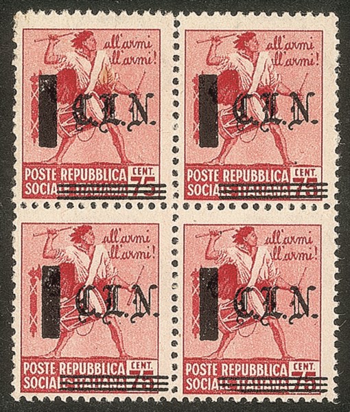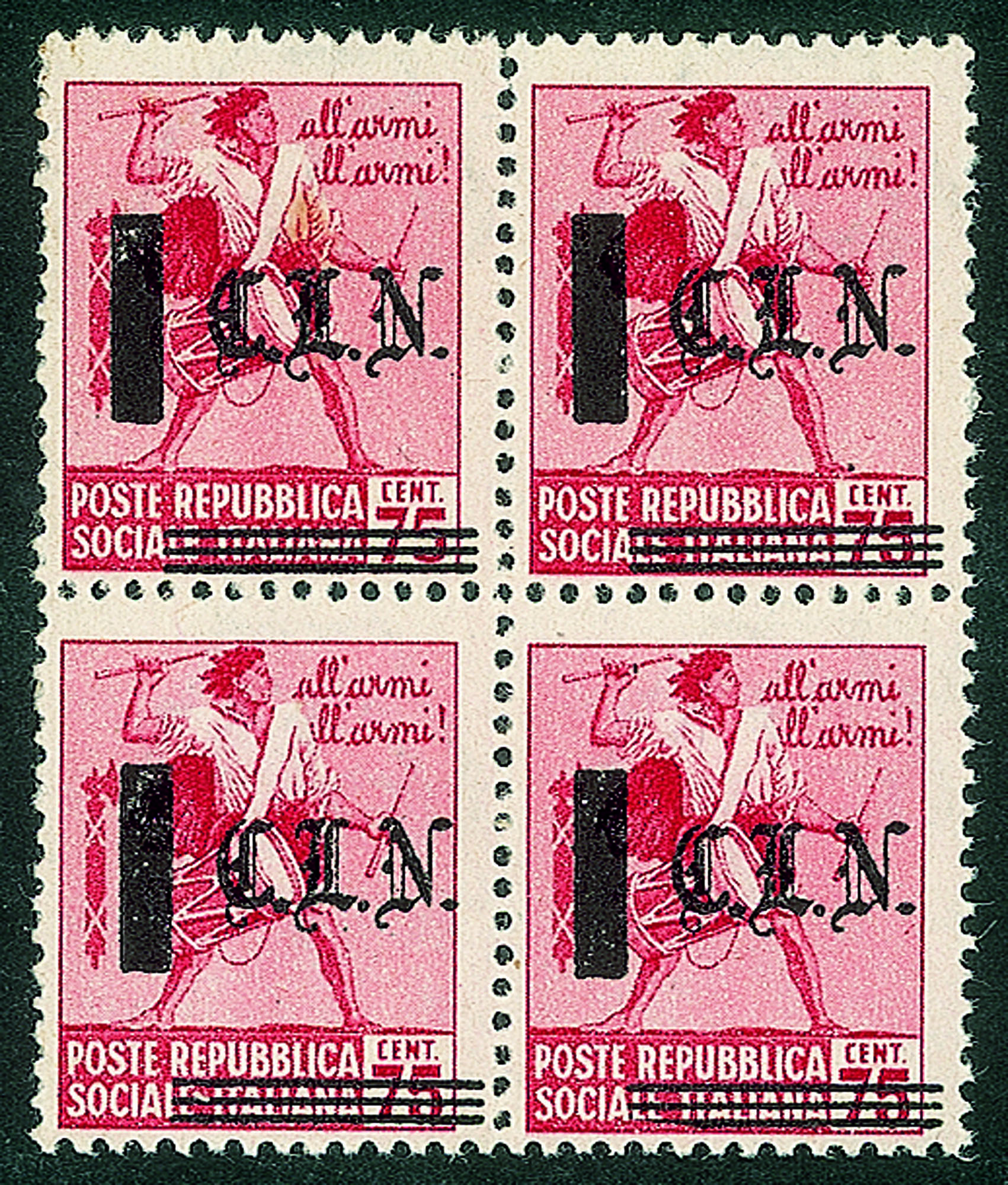 Emissioni CLN - 1945 - 75 cent (Errani 10) - quartina con soprastampe spostate e disallineate (fasci visibili)