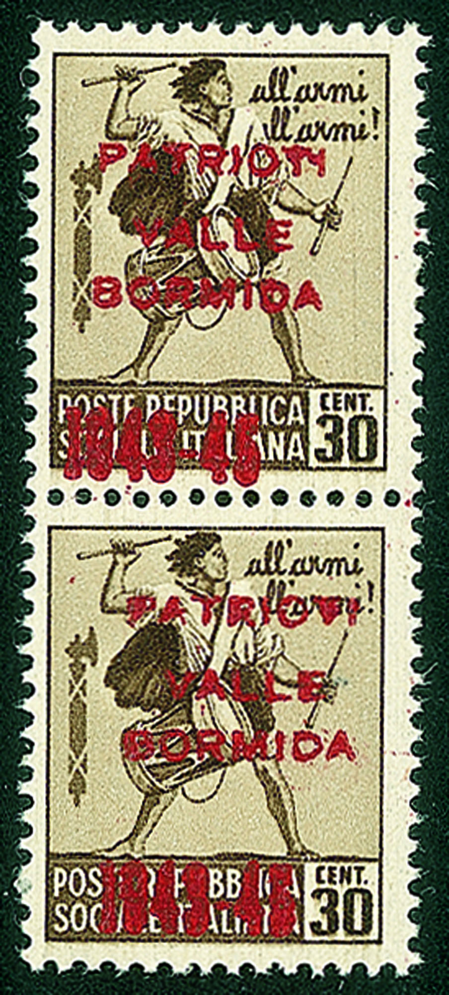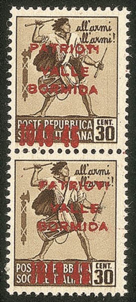 Emissioni CLN - 1945 - 30 cent (4A+4A varerà c) - coppia verticale con soprastampe disallineate (spostata a sinistra nel pezzo superiore)