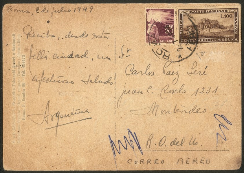 Su cartolina da Roma a Montevideo del 2.7.49
