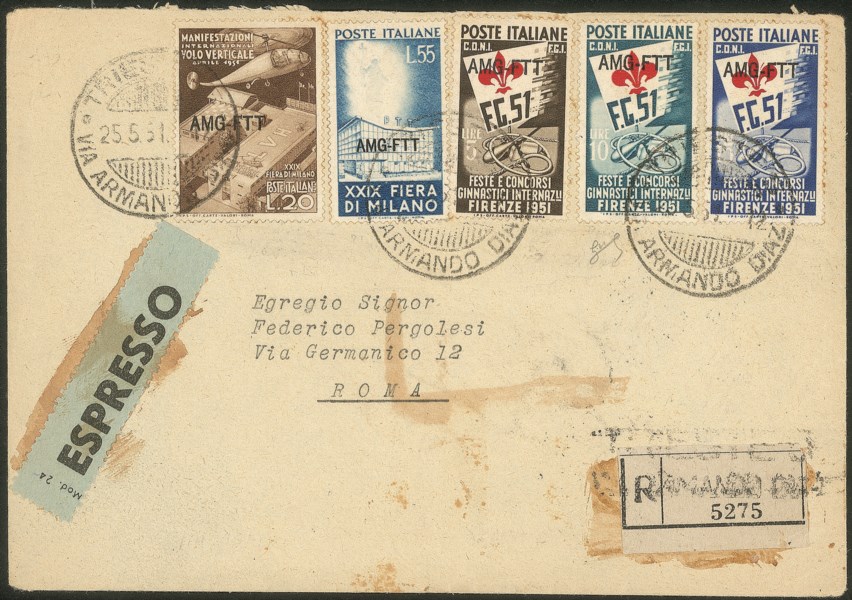 5 valori su raccomandata espresso per Roma del 25.5.51 (in tariffa) - cert. Biondi